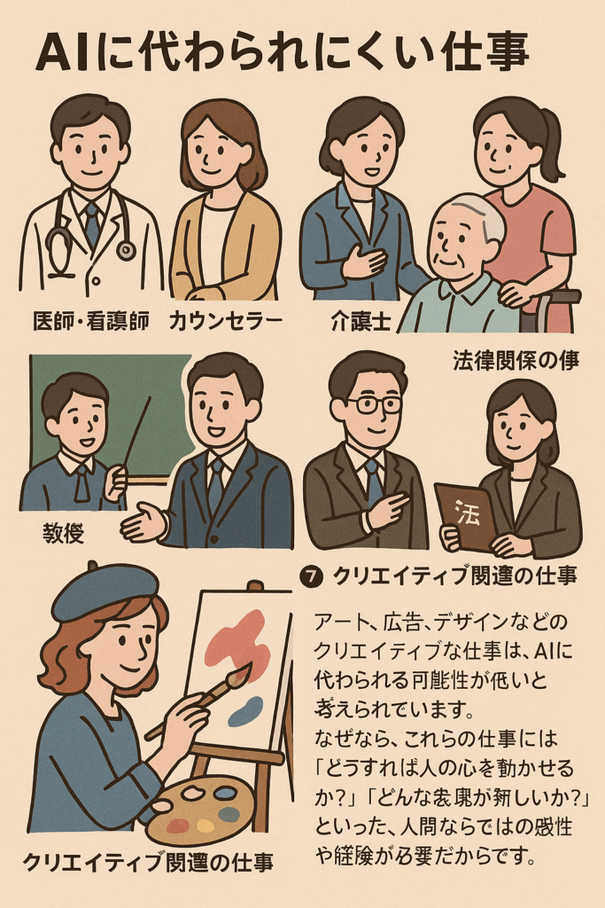 AIの技術が進化する中で、「AIに代わられにくい」と考えられている仕事があります。ここでは、そうした仕事を7つ紹介します。