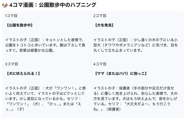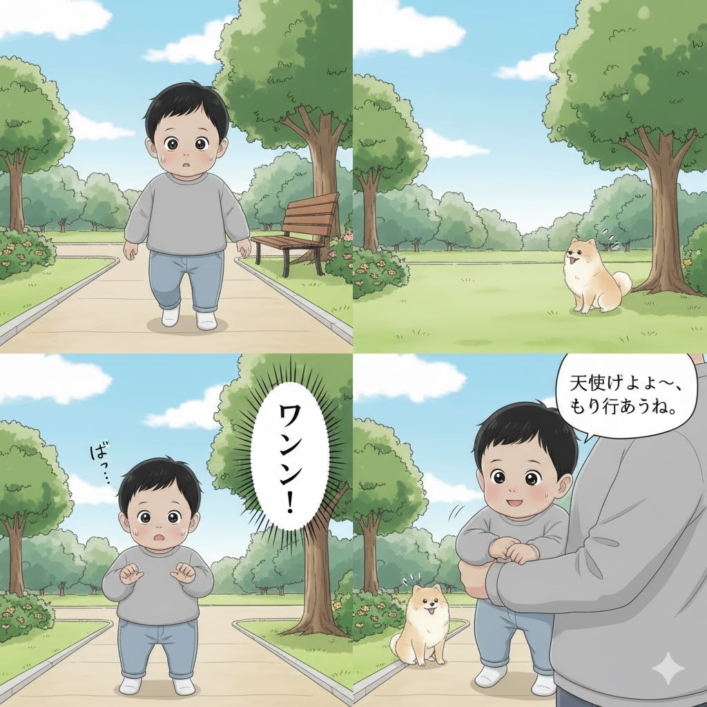 nano bananaを使って漫画制作してみた 2025/12/17 ①まず、赤ちゃんの頃の息子の写真を読み込み、イラストを作成。 ②次に全身のイラストも作成 ③適当にこのイラストの子を使って4コマ漫画作成してと指示。 こういうストーリーはどうですか?とプロットが出る。 ④4コマ漫画作成を指示 こんな感じで生成。 文字バケしてるし・・もっとプロンプトを細かく指示しないといけないですね。 でも、やってみるとおもしろい! 絵が描けない人でも、簡単に高度な漫画を制作できる時代の到来。 すごい時代だ!!